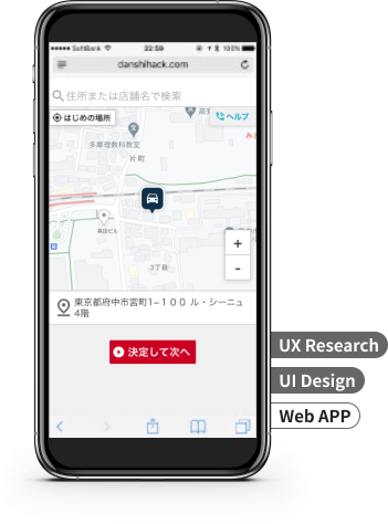 PoC段階から参画し、ロードサービスの受付業務(受電スクリプト〜配車〜顧客到着まで)のフローを洗い出しました。受電後の状況ヒアリングをWEBフォームに置き換え、受付後の配車状況を利用者に表示することで、状況共有と安心感を向上させました。これにより待ち時間の体感時間を短縮し、受付業務時間の削減も目指しました。ビジュアル面はPoC時点から幅広い年齢層と屋外利用を想定し、華美でない簡易な見た目を採用しましたが、本運用前に整える余地がありました。